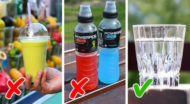 -มันเป็นสิ่งที่หายากมากเมื่อพวกเขาเสนอสิ่งที่ดีต่อสุขภาพอย่างแท้จริง ตัวอย่างเช่นสมูทตี้ที่มีวิตามินและน้ำผลไม้สดสามารถระคายเคืองกระเพาะอาหารที่กำลังหิวและนำไปสู่ปัญหาการย่อยอาหาร และน้ำผลไม้ทั่วไปและเครื่องดื่มเพื่อนักกีฬามีน้ำตาลมากที่สุดเท่าที่โซดาปกติ ทางเลือกที่ดีต่อสุขภาพคือน้ำเปล่านี่เอง