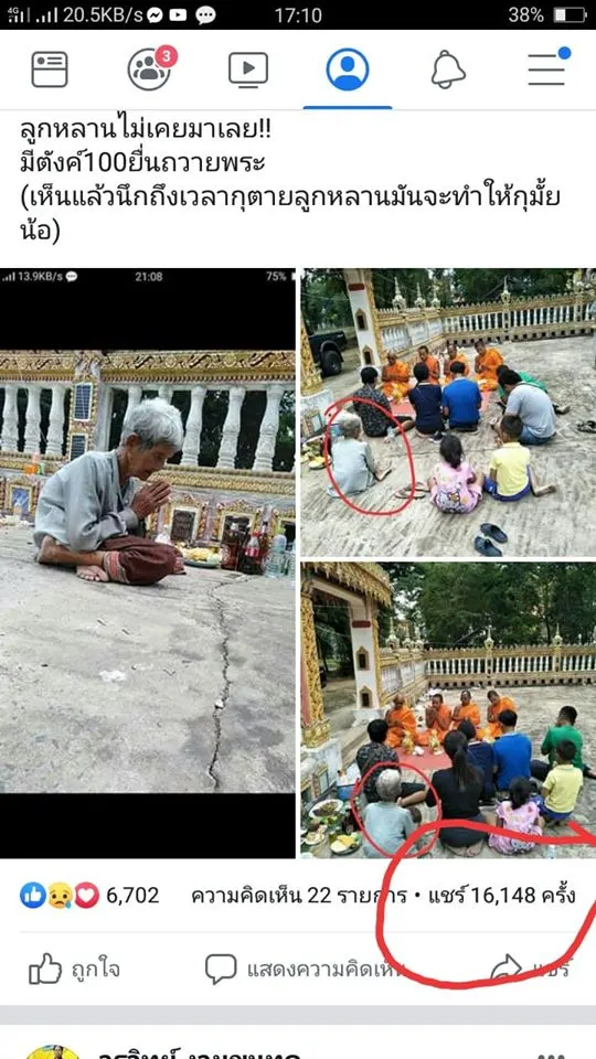 โดยเจ้าของเฟซบุ๊กชื่อ วรวิทย์ งามขุนทด ได้โพสต์ภาพคุณยายคนดังกล่าว พร้อมกับเล่าเรื่องราวชวนน้ำตามซึมว่า “ยายมาคนเดียว!! มาทำบุญให้ตา ลูกหลานไม่เคยมาเลย!! มีตังค์100 ยื่นถวายพระ (เห็นแล้วนึกถึงเวลากูตายลูกหลานมันจะทำให้กูมั้ยน้อ)”