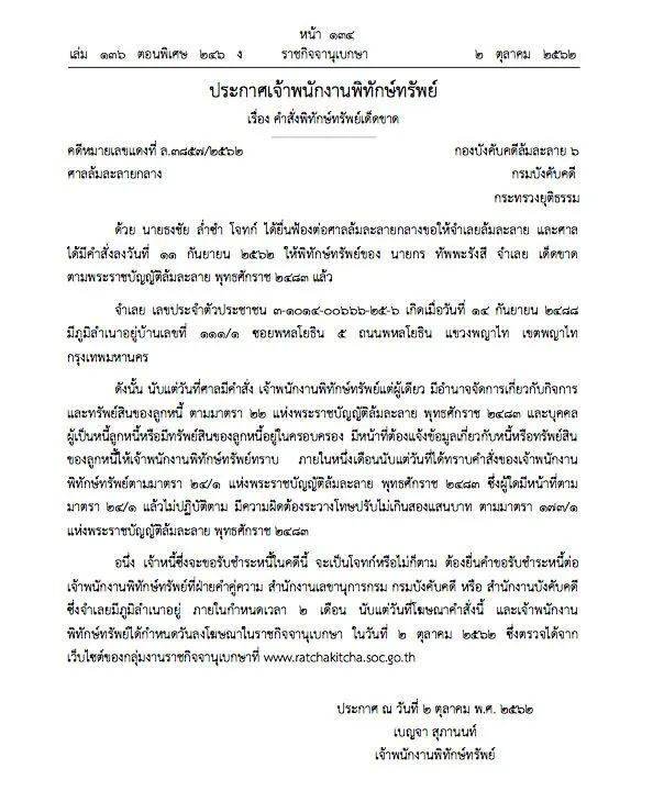 อนึ่ง เจ้าหน้าที่ซึ่งจะขอรับชำระหนี้ในคดีนี้ จะเป็นโจทก์หรือไม่ก็ตาม ต้องยื่นคำขอรับชำระหนี้ต่อเจ้าพนักงานพิทักษ์ทรัพย์ที่ฝ่ายคำคู่ความ สำนักงานเลขานุการกรม กรมบังคับคดี หรือสำนักงานบังคับคดีซึ่งจำเลยมีภูมิลำเนาอยู่ ภายในกำหนดเวลา 2 เดือน นับแต่วันที่โฆษณาคำสั่งนี้ และเจ้าพนักงานพิทักษ์ทรัพย์ได้กำหนดวันลงโฆษณาในราชกิจจานุเบกษา ในวันที่ 2 ตุลาคม 2562 ซึ่งตรวจได้จาก เว็บไซต์ของกลุ่มงานราชกิจจานุเบกษา www.ratchakitcha.soc.go.th