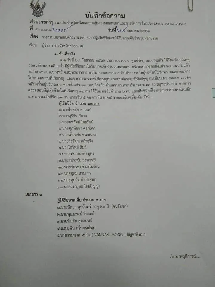 กรณีอุบัติเหตุสุดสะเทือนขวัญมีผู้เสียชีวิต 13 ราย ทั้งหมดเป็นนักศึกษาวิทยาลัยเทคนิคศรีสะเกษ เกิดขึ้นเมื่อเวลา 00.40 น. ของวันที่ 29 ก.ย. 62 เจ้าหน้าที่ตำรวจ สภ.บางแก้ว จ.สมุทรปราการ รับแจ้งอุบัติเหตุรถกระบะชนเสาไฟฟ้าแล้วพลิกคว่ำ มีผู้เสียชีวิตและบาดเจ็บจำนวนมาก บนถนนกิ่งแก้ว มุ่งหน้าลาดกระบัง ก่อนถึงวัดกิ่งแก้ว ประมาณ 200 เมตร ต.ราชาเทวะ อ.บางพลี จ.สมุทรปราการ ซึ่งร่างของ13 นักศึกษาวิทยาลัยเทคนิคศรีสะเกษ ได้กลับถึงบ้านเกิด อยู่ในระหว่างที่ครอบครัวนำไปประกอบพิธีกรรมทางศาสนา