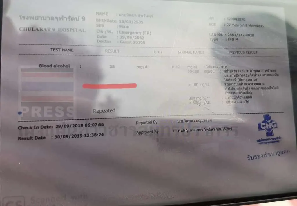 สำหรับ ผลการตรวจปริมาณแอลกอฮอล์ในกระแสเลือดของนายนิตยา มีเกินกว่า 20 มิลลิกรัมเปอร์เซ็นต์ จึงถูกแจ้งข้อหานี้ไปด้วย และยังมีข้อหาขับรถโดยประมาทเป็นเหตุให้เกิดอันตรายแก่บุคคลหรือทรัพย์สิน ทั้งทรัพย์สินทางราชการและทรัพย์สินที่เป็นของประชาชนด้านข้างถนน ใช้รถไม่ตรงกับประเภทที่จดทะเบียนไว้ คือรถบรรทุกสิ่งของแต่นำมาบรรทุกคน ถือว่าเป็นการใช้รถไม่ตรงใช้รถไม่ตรงกับประเภทที่จดทะเบียนไว้ โดย พ.ต.อ.พิสุทธิ์ จันทรสุวรรณ ผกก. สภ.บางแก้ว จ.สมุทรปราการ ได้เผยหลักฐานการตรวจวัดระดับเเอลกอฮอล์ของคนขับกระบะ ให้ดูอย่างชัดเจน ที่ระดับ 38 มิลลิกรัม