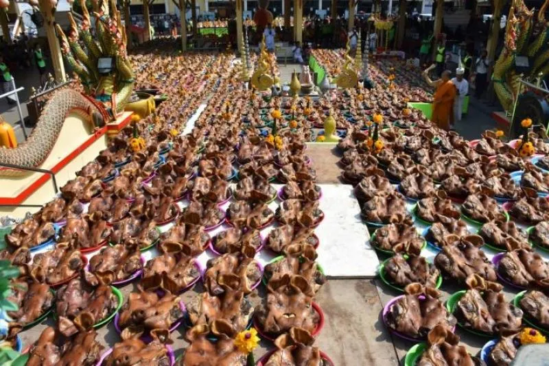 หนุ่มใหญ่ ถวายหัวหมู 1,200 หัว แก้บนหลวงพ่อสมหวัง หลังถูกรางวัล 12 ล้าน