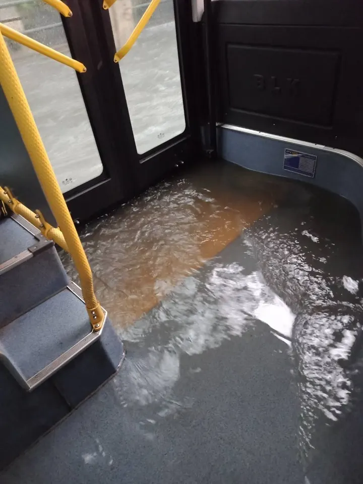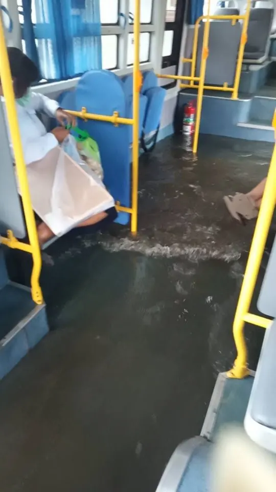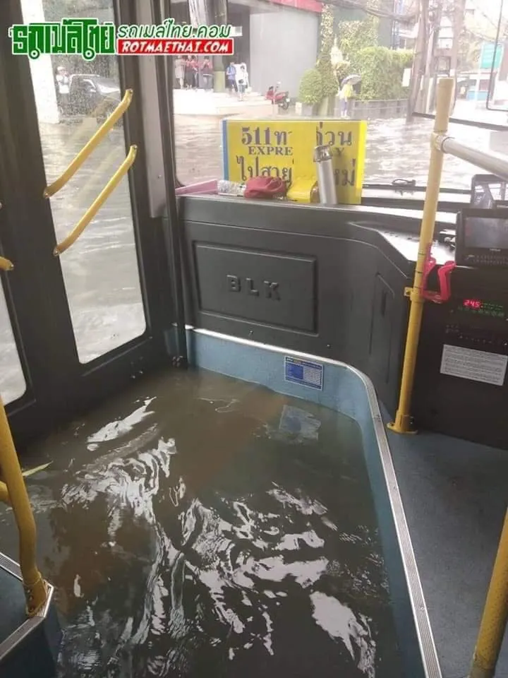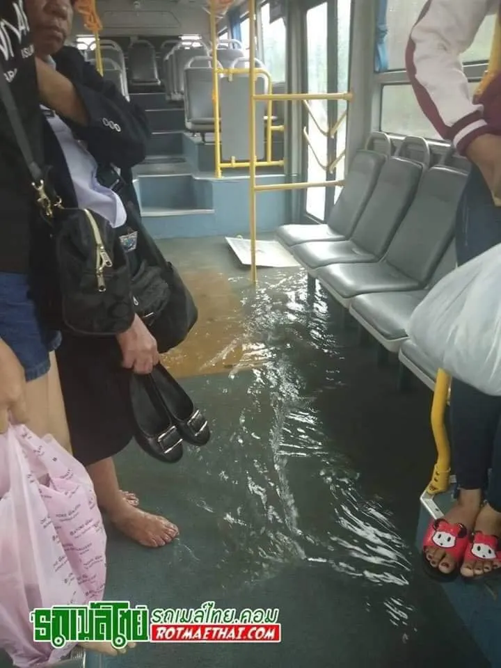 เฟซบุ๊ก รถเมล์ไทยแฟนคลับ Rotmaethai.com โพสท์ภาพที่เผยให้เห็นสภาพรถเมล์ที่ถูกน้ำท่วมเข้าไปข้างใน เป็นผลมาจากฝนตกหนัก ผู้โดยสาร กระเป๋ารถเมล์ต้องถอดรองเท้ากันเลยทีเดียวแน่นอนว่า น้ำท่วมเข้าไปในรถเมล์สีฟ้ารุ่นใหม่ด้วย