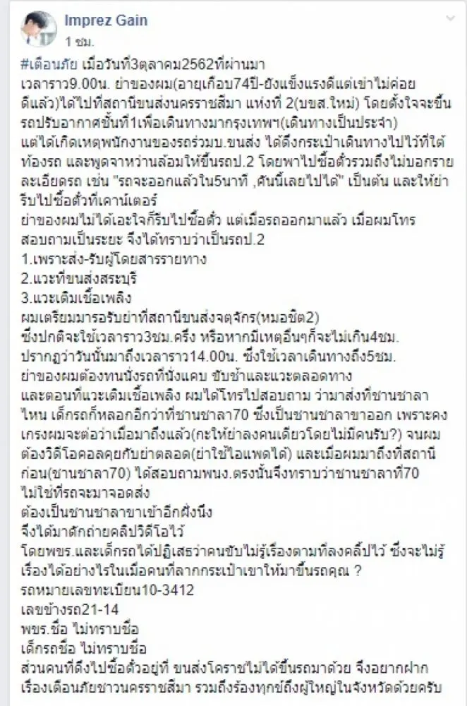 เรียกได้ว่าเป็นเรื่องราวที่มีคนแห่แชร์กันเป็นจำนวนมาก เมื่อเฟสบุ๊ก Imprez Gain แชร์เรื่องราวลงกลุ่มข่าว คนโคราชบ้านเอ็ง ระบุว่า เตือนภัย เมื่อวันที่3ตุลาคม2562ที่ผ่านมา เวลาราว9.00น. ย่าของผม(อายุเกือบ74ปี-ยังแข็งแรงดีแต่เข่าไม่ค่อยดีแล้ว)ได้ไปที่สถานีขนส่งนครราชสีมา แห่งที่ 2(บขส.ใหม่) โดยตั้งใจจะขึ้นรถปรับอากาศชั้นที่1 เพื่อเดินทางมากรุงเทพฯ(เดินทางเป็นประจำ) แต่ได้เกิดเหตุพนักงานของรถร่วมบขส. ได้ดึงกระเป๋าเดินทางไปไว้ที่ใต้ท้องรถ และพูดจาหว่านล้อมให้ขึ้นรถป.2 โดยพาไปซื้อตั๋ว รวมถึงไม่บอกรายละเอียดรถ เช่น "รถจะออกแล้วใน5นาที ,คันนี้เลยไปได้" เป็นต้น และให้ย่ารีบไปซื้อตั๋วที่เคาน์เตอร์ ย่าของผมไม่ได้เอะใจก็รีบไปซื้อตั๋ว แต่เมื่อรถออกมาแล้ว เมื่อผมโทรสอบถามเป็นระยะ จึงได้ทราบว่าเป็นรถป.2