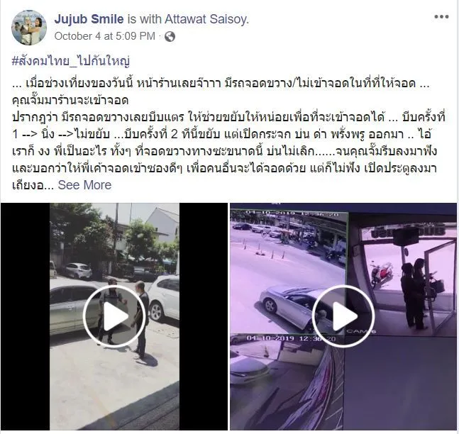 จากกรณีที่ทางผู้ใช้เฟซบุ๊ค Jujub Smile ได้เผยคลิปเหตุการณ์เมื่อวันที่4 ต.ค.62 ที่ผ่านมา เจ้าของรถรายหนึ่ง มาจอดขวาง ก่อนจะมีการปะทะคารมณ์กันเดือด จากนั้นเจ้าของรถที่จอดขวางก็เปิดประตูรถลงมาเถียง เค้าจอดบนถนน ไม่ได้จอดขวาง (คลิปท้ายข่าว)
