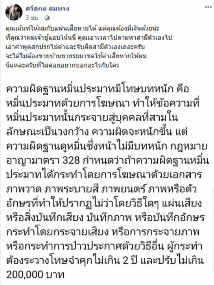 ล่าสุดวันที่ 7 ตุลาคม 2562 ผู้สื่อข่าวรายงานว่า ผู้ใช้เฟซบุ๊กดังกล่าวออกมาโพสต์อีกว่า คุณเม้นท์ให้ผมกับแฟนเสียหายได้ แต่คุณต้องมีเงินด้วยน่ะ ที่คุณว่าผมเจ้าชู้แอบโน้นนี่ คุณเอาเวลาไปตามหาสามีตัวเองไป เอาคำพูดสกปรกไปด่าและจับผิดสามีตัวเองเถอะครับ จะได้ไม่ต้องขายบ้านขายรถมาชดใช้ค่าเสียหายให้ผม นี่แหละครับที่ไม่ค่อยอยากบอกอะไรกับใคร