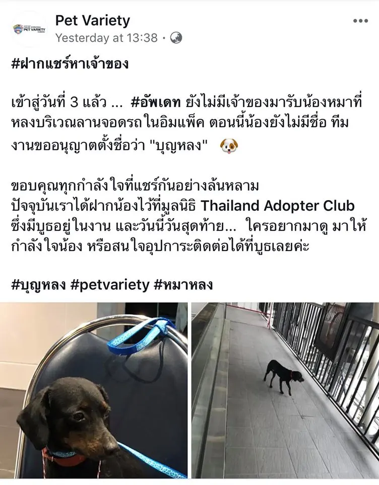 โดยเจ้าของโพสต์ได้ระบุข้อความเอาไว้ว่า มีน้องหมาพลัดหลงจากเจ้าของใครรู้จักหมาหรือรู้จักเจ้าของมาให้มาติดต่อได้ที่เจ้าหน้าที่ Pet Variety ที่หน้า Hall 8 ด่วนเลยนะคะ พบน้องอยู่ที่ จอดรถ P2 อาคาร Forum ค่ะ เข้าสู่วันที่ 3 แล้ว อัปเดต ยังไม่มีเจ้าของมารับน้องหมาที่หลงบริเวณลานจอดรถในอิมแพ็ค