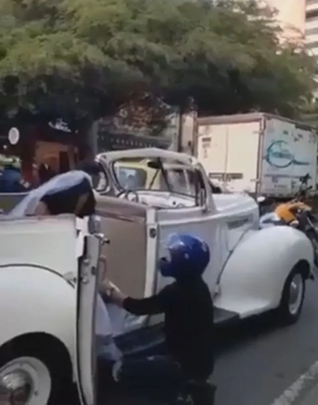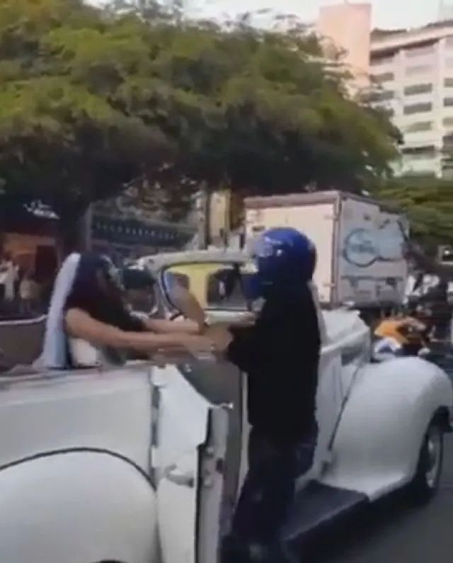 ฝ่ายหญิงกำลังจะแต่งงานนั่งอยู่ในรถโบราณซึ่งติดเครื่องอยู่บนถนนและกำลังจะนำเธอไปยังสถานที่จัดพิธีอยู่ๆมีชายคนหนึ่งจอดมอเตอร์ไซค์ของเขาและเข้าไปพูดคุยกับว่าที่เจ้าสาวที่นั่งอยู่ภายในรถก่อนจะคุกเข่าลงและขอร้องไม่ให้เธอไปแต่งงานแต่ตัวหญิงสาวที่ไม่ยินยอมเธอผลักเขาออกผู้เห็นเหตุการณ์กล่าวว่า หญิงสาวก็ยังคงเดินทางไปเข้าพิธีแต่งงานของเธอกับว่าที่สามี ส่วนชายหนุ่มในคลิปก็ถูกทิ้งไว้กับความผิดหวัง