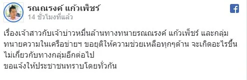 ล่าสุด! ทนายรณณรงค์ ออกมาโพสต์เฟซบุ๊กส่วนตัว ว่า “เรื่องเจ้าสาวกับเจ้าบ่าวหมื่นล้านทางทนายรณณรงค์ แก้วเพ็ชร์ และกลุ่มทนายความในเครือข่ายฯ ขอยุติให้ความช่วยเหลือทุกๆด้าน จะเกิดอะไรขึ้นไม่เกี่ยวกับทางกลุ่มอีกต่อไป ขอแจ้งให้ประชาชนทราบโดยทั่วกัน”