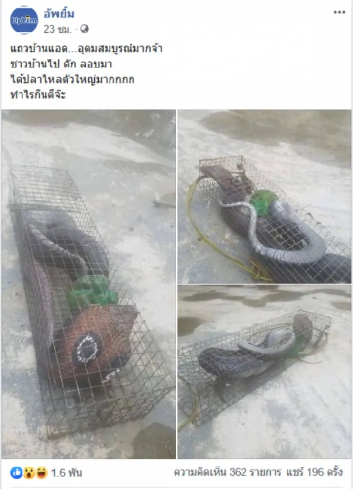 วันที่ 10 ตุลาคม 2562 ผู้สื่อข่าวรายงานว่า โลกออนไลน์มีการแชร์ภาพของผู้ใช้เพจเฟซบุ๊กชื่อ อัพยิ้ม ซึ่งได้โพสต์ภาพคล้ายงูตัวอยู่ที่ติดอยู่ในกรง โดยผู้ใช้เพจเฟซบุ๊กดังกล่าวระบุข้อความว่า แถวบ้านแอด อุดมสมบูรณ์มากจ้า ชาวบ้านไป ดัก ลอบมา ได้ปลาไหลตัวใหญ่มากกกก ทำไรกินดีจ๊ะ