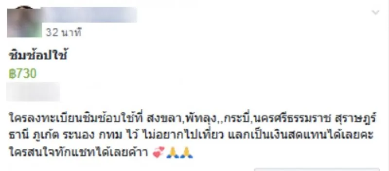 เรียกได้ว่าเป็นเรื่องราวที่ฮือฮาอย่างมากสำหรับโครงการชิมช้อปใช้ ที่ตอนนี้ประชาชนแห่ใช้สิทธิ์กันอย่างล้นหลาม และก็มีสำหรับบางคนที่ลงพื้นที่ห่างไกล ต้องเสียสิทธิ์ใช้เงิน1,000ไป โดยที่ยังไม่ได้ใช้ ล่าสุดมีผู้ใช้เฟสบุ๊ครายหนึ่งได้โพสต์ข้อความรับแลกเงินสด สำหรับใครที่ไม่ได้ไปใช้สิทธิ์ โดยได้ระบุข้อความว่า ใครลงทะเบียนชิมช้อบใช้ที่ สงขลา,พัทลุง,,กระบี่,นครศรีธรรมราช สุราษฎร์ธานี ภูเก้ต ระนอง กทม ไว้ ไม่อยากไปเที่ยว แลกเป็นเงินสดแทนได้เลยคะ ใครสนใจทักแชทได้เลยค้าา