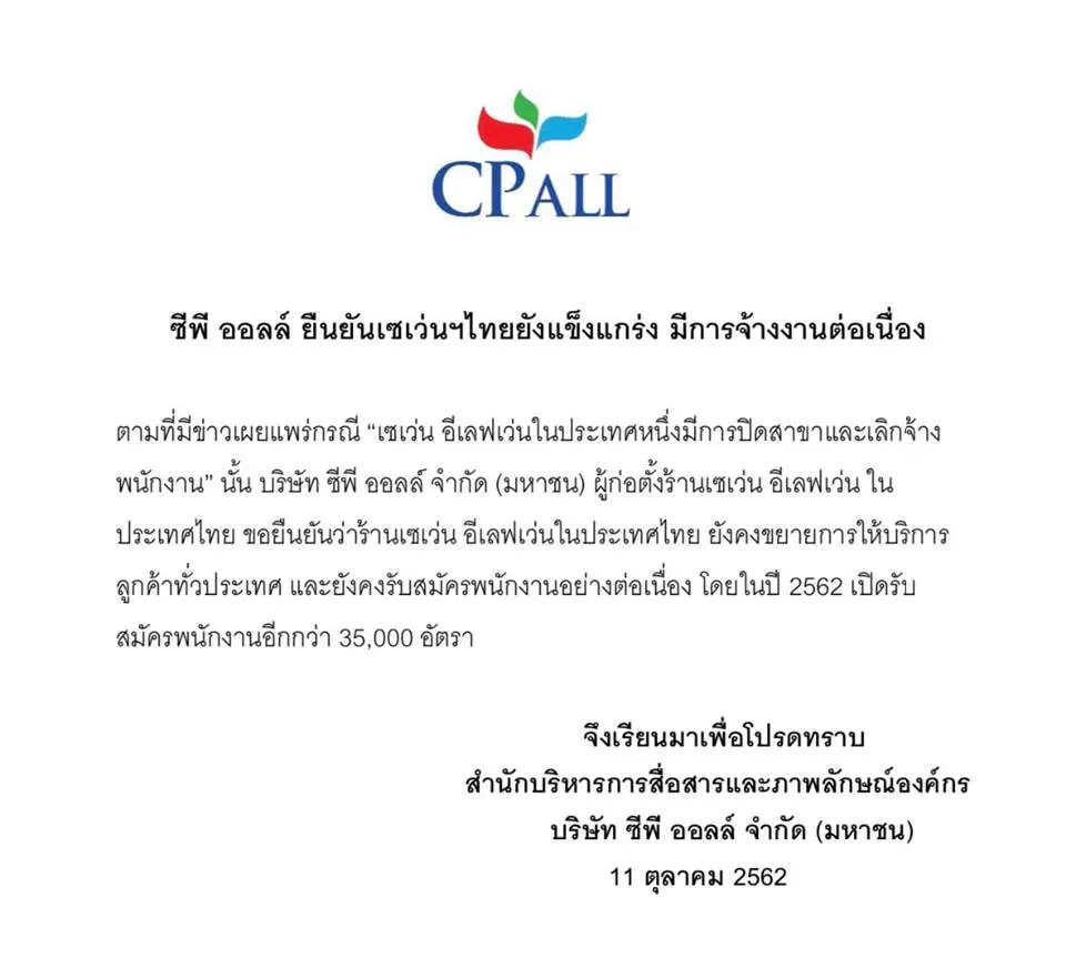 11 ตุลาคม 62 ซีพี ออล์ ชี้แจง ยัน เซเว่นฯ ไทยยังแข็งแกร่ง มีการจ้างงานต่อเนื่อง โดยชี้แจงรายละเอียดดังนี้ ตามที่มีข่าวเผยแพร่กรณี เซเว่น อีเลฟเว่นในประเทศหนึ่งมีการปิดสาขาและเลิกจ้างพนักงานนั้น บริษัทซีพีออลล์ จำกัด (มหาชน) ผู้ก่อตั้ง ร้านเซเว่น อีเลฟเว่น ในประเทศไทย ขอยืนยันว่า ร้านเซเว่น อีเลฟเว่น ในประเทศไทย ยังคงขยายการให้บริการลูกค้าทั่วประเทศ และยังคงรับสมัครพนักงานอย่างต่อเนื่อง โดยในปี 2562 เปิดรับสมัครพนักงานอีกกว่า 35, 000 อัตรา