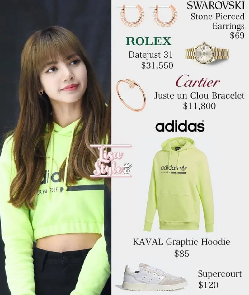 เสื้อกันหนาว adidas Kaval Graphic Hoodie ราคา 85 ดอลลาร์สหรัฐ หรือประมาณ 2,500 บาท ต่างหู SWAROVSKI ราคา 69 ดอลลาร์สหรัฐ หรือประมาณ 2,000 บาท นาฬิกา ROLEX ราคา 31,550 ดอลลาร์สหรัฐ หรือประมาณ 950,000 บาท ข้อมือ Cartier ราคา 11,800 ดอลลาร์สหรัฐ หรือประมาณ 350,000 บาท รองเท้า adidas Super Court ราคา 120 ดอลลาร์สหรัฐ หรือประมาณ 3,600 บาท