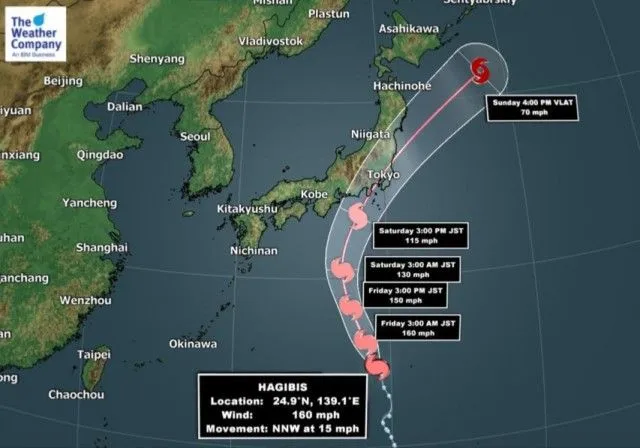 อุตุนิยมวิทยาญี่ปุ่นประกาศแจ้งเตือน ซูเปอร์ไต้ฝุ่น ฮากิบิส ที่คาดว่าจะเคลื่อนผ่าน หมู่เกาะโองาซาวาระ มุ่งหน้ามายังภูมิภาคคันโต ทางตะวันออกของเกาะฮอนชู ญี่ปุ่น ซึ่งประกอบด้วย 8 จังหวัด รวมทั้งกรุงโตเกียว เมืองหลวง ในคืนวันเสาร์ที่ 12 ต.ค.เข้าเช้าวันอาทิตย์ที่ 13 ต.ค. ทำให้ตอนนี้ทางการญี่ปุ่น และชาวญี่ปุ่นต่างเตรียมความพร้อมรับมือซูเปอร์ไต้ฝุ่นลูกนี้
