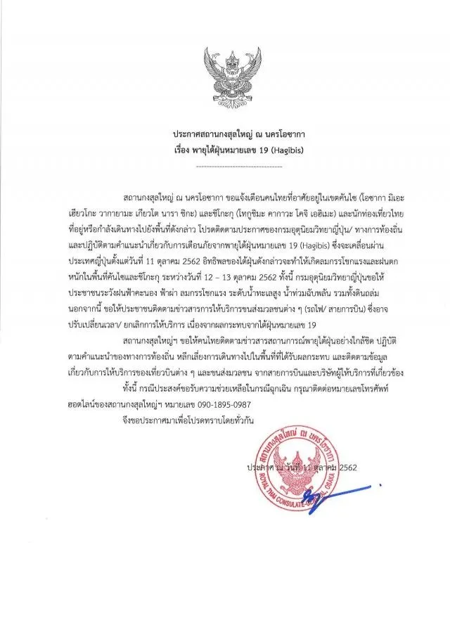 ด้าน สถานกงสุลใหญ่ ณ นครโอชากา ออกประกาศ เรื่อง พายุไต้ฝุ่นหมายเลข 19 (Hagibis)สถานกงสุลใหญ่ ณ นครโอซากา ขอแจ้งเตือนคนไทยที่อาศัยอยู่ในเขตคันไซ (โอซากา มิเอะเฮียวโกะ วากายามะ เกียวโต นารา ชิกะ) และชิโกะกุ (โหกูชิมะ คากาวะ โคจิ เอฮิเมะ) และนักท่องเที่ยวไทยที่อยู่หรือกำลังเดินทางไปยังพื้นที่ดังกล่ว โปรดติดตามประกาศของกมอุตุนิยมวิทยาญี่ปุน/ หางการท้องถิ่นและปฏิบัติตามคำแนะนำเกี่ยวกับการเตือนภัยจากพายุไต้ฝุ่นหมายเลข 19 (Hagibis)