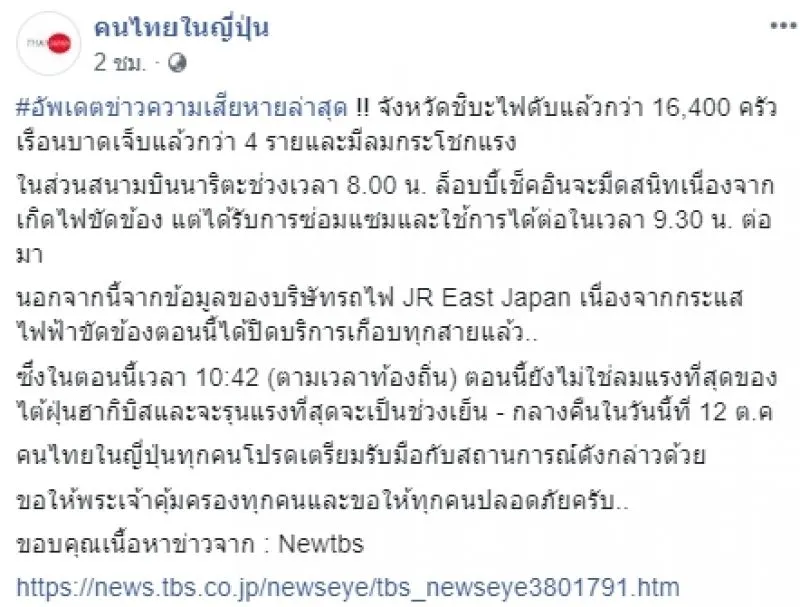 อัพเดตความเสียหายล่าสุดพายุเข้าญี่ปุ่น ชิบะไฟดับแล้วกว่า 16,400 ครัวเรือน