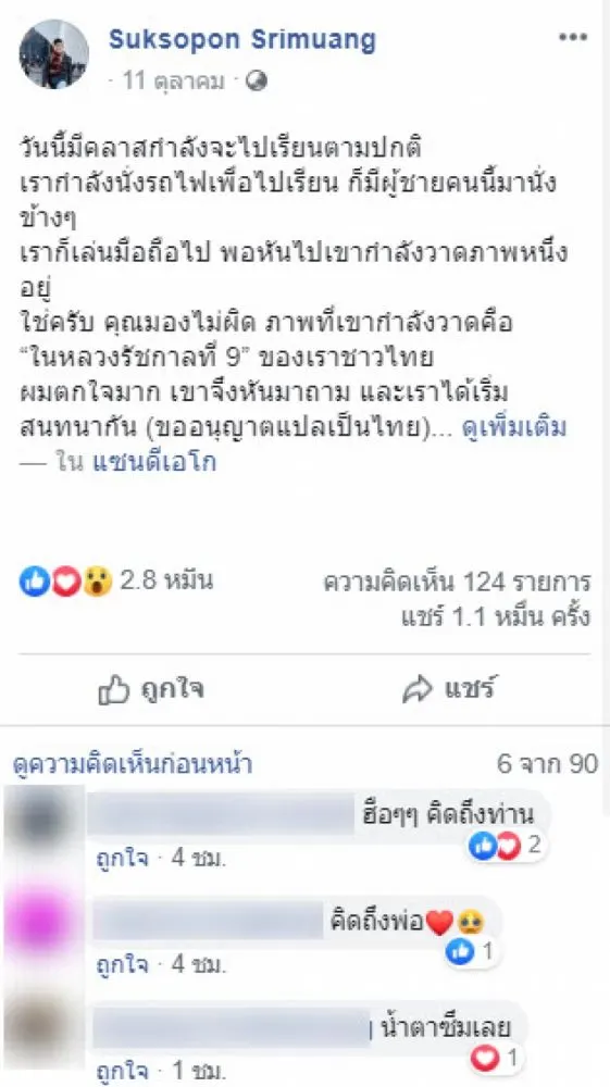 อย่างล่าสุดเกิดเรื่องราวสุดประทับใจขึ้นกับหนุ่มไทยในเมือง ซาน ดิเอโก รัฐแคลิฟอร์เนีย ประเทศสหรัฐอเมริกาขึ้น โดยเจ้าของเฟซบุ๊กชื่อ Suksopon Srimuang ได้โพสต์ภาพชายชาวต่างชาติคนหนึ่ง พร้อมเล่าเรื่องราวว่า วันนี้ มีคลาสกำลังจะไปเรียนตามปกติ เรากำลังนั่งรถไฟเพื่อไปเรียน ก็มีผู้ชายคนนี้มานั่งข้างๆ เราก็เล่นมือถือไป พอหันไปเขากำลังวาดภาพหนึ่งอยู่ ใช่ครับ คุณมองไม่ผิด ภาพที่เขากำลังวาดคือ “ในหลวงรัชกาลที่ 9 ของเราชาวไทย ผมตกใจมาก เขาจึงหันมาถาม และเราได้เริ่มสนทนากัน (ขออนุญาตแปลเป็นไทย)