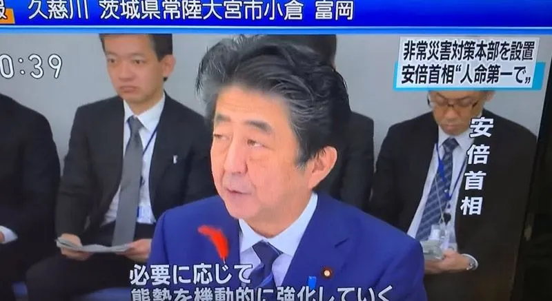 - นายกรัฐมนตรี ชินโสะ อาเบะ ได้ออกมาเรียกประชุมฉุกเฉินกับทุกฝ่าย ในอาการที่เหมือนกับยังไม่ได้นอน เพราะเป็นผู้บัญชาการวอร์รูมรับมือกับภัยพิบัติทั้งคืน ร่วมกับมีรัฐมนตรีกระทรวงก่อสร้างและคมนาคม กระทรวงมหาดไทย รัฐมนตรีกระทรวงเพื่อการฟื้นฟู รวมถึงผู้เชี่ยวชาญการที่เกี่ยวข้องทุกสาขา อย่างพร้อมเพรียง