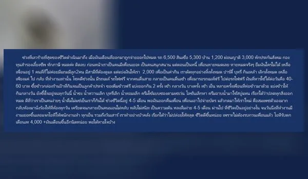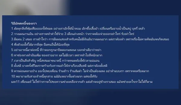 เจ้าของกระทู้ได้บอกว่าแต่เดิมเขาเป็นเด็กบ้านนอก ไม่เคยมีอะไร ไม่เคยได้อะไร ตอนเรียนก็ขอทุนมาตลอด มีปัญหาทางครอบครัวพ่อแม่แยกทางกันจึงต้องหาเลี้ยงตนเองจนจบม.6 พอเรียนจบช่วงทำงานทำให้มี บัตรเครดิต บัตรกดเงินสดและสินเชื่อ รายได้รวมตอนนั้น อยู่ที่ 22,000-25,000 จากเด็กที่ไม่มีอะไรเลยทำให้ใช้เงินกิน เที่ยว ซื้อ รูดบัตรทดแทนสิ่งที่ไม่เคยมี เขาผ่อนรถด้วยการกดเงินในบัตรมาดาวน์รถ 1 แสน ใช้ชีวิตอยู่แบบเดิมหลายปี เงินก็เริ่มไม่ค่อยคล่อง รถปีที่ 2 เริ่มผ่อนประกันเอง จ่ายค่าบำรุงรักษาเริ่มแพงขึ้น จากหลักพันเริ่มเป็นหลายพันจนถึงหลักหมื่นในบางช่วง เขาจึงหาช่องทางทำเงินต่อด้วยการไปขายของที่ตลาดนัด ศุกร์ เสาร์ อาทิตย์ ขายเครื่องสำอางค์ กู้เงินธนาคารมาดำเนินธุรกิจ 50,000 ซึ่งช่วงแรกขายดีเลยตัดสินใจลาออกมาขายของเต็มตัวเพราะได้กำไร พอภายหลังๆ ยอดขายเริ่มตกจนบางวันขายไม่ได้เลย ซึ่งมารู้ว่ามีร้านอื่นมาเปิดขายแข่ง สุดท้ายเขาเจ๊งเพราะขาดประสบการณ์ ทุนไม่หนา การตลาดไม่เป็น