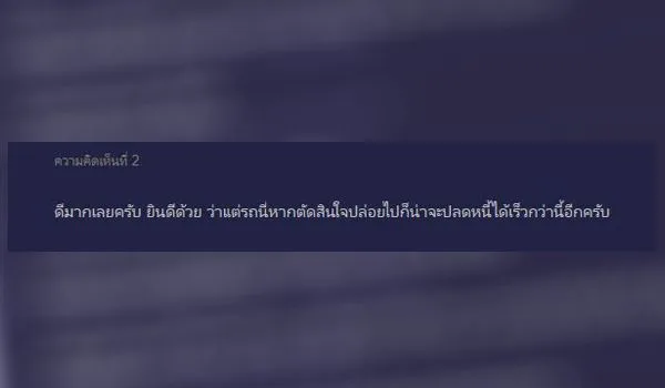มาที่ความคิดเห็นแรกบอกว่าถ้าปล่อยรถจะทำให้ปลดหนี้ได้ไวกว่านี้ และยังมีอีกหลายความคิดเห็นที่มีทำนองเดียวกันคือเรื่องปล่อยรถ จะเก็บไว้ทำไมขับก็ไม่ได้ขับเพราะไม่มีตังค์จ่ายค่าน้ำมัน เจ้าของกระทู้ได้มาตอบกลับด้วยเหตุผลข้างล่าง