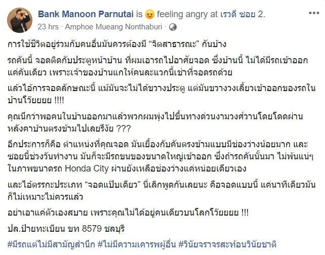 การใช้ชีวิตอยู่ร่วมกับคนอื่นมันควรต้องมี “จิตสาธารณะ” กันบ้าง รถคันนี้ จอดติดกับประตูหน้าบ้าน ที่ผมเอารถไปอาศัยจอด ซึ่งบ้านนี้ ไม่ได้มีรถเข้าออกแค่คันเดียว เพราะเจ้าของบ้านแกให้คนละแวกนี้เช่าที่จอดรถด้วยแล้วไอ้การจอดลักษณะนี้ แม้มันจะไม่ได้ขวางประตู แต่มันขวางวงเลี้ยวเข้าออกของรถในบ้านโว๊ยยยย
