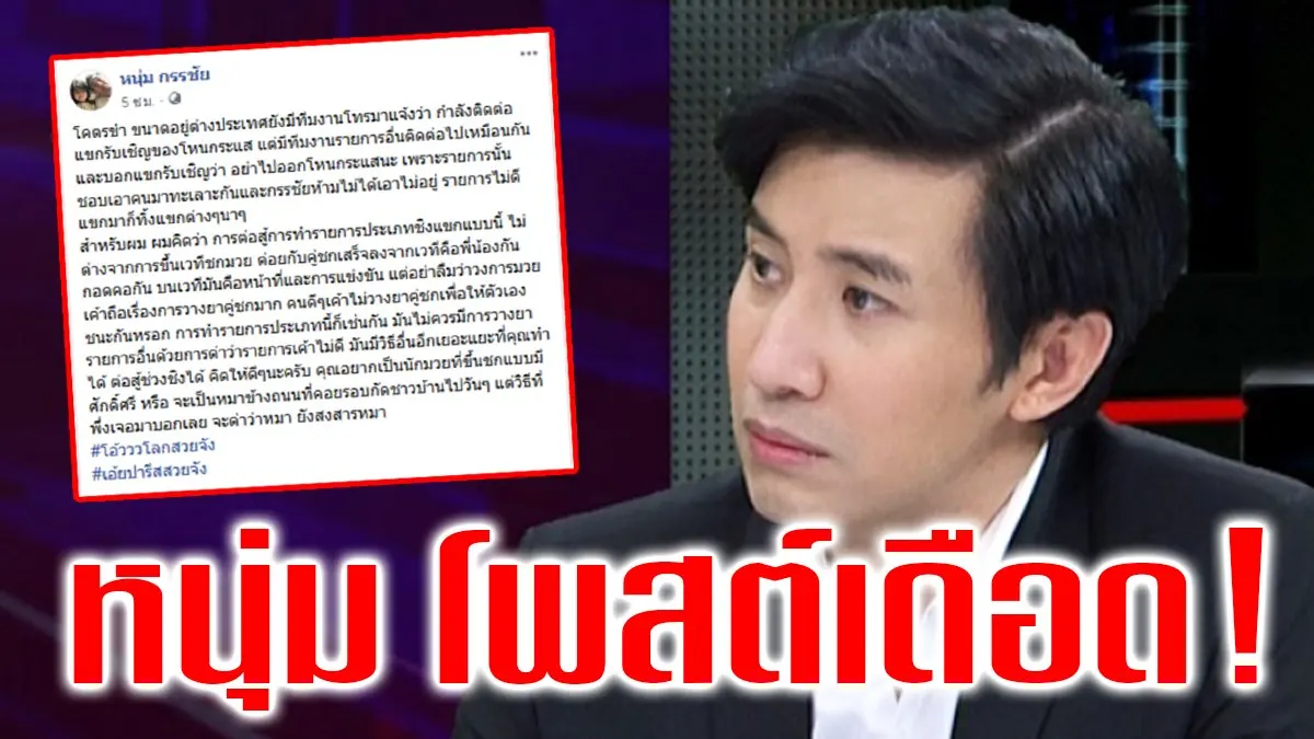 16 ต.ค. หนุ่ม กรรชัย กำเนิดพลอย นักแสดงและพิธีกรชื่อดัง ได้โพสต์ข้อความผ่านเฟซบุ๊กแฟนเพจ หนุ่ม กรรชัย ระบุว่า โคตรขำ ขนาดอยู่ต่างประเทศยังมีทีมงานโทรมาแจ้งว่า กำลังติดต่อแขกรับเชิญของโหนกระแส แต่มีทีมงานรายการอื่นติดต่อไปเหมือนกัน และบอกแขกรับเชิญว่า อย่าไปออกโหนกระแสนะ เพราะรายการนั้นชอบเอาคนมาทะเลาะกันและกรรชัยห้ามไม่ได้เอาไม่อยู่ รายการไม่ดี แขกมาก็ทิ้งแขกต่างๆนาๆ