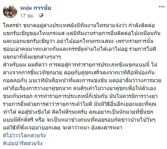 การทำรายการประเภทนี้ก็เช่นกัน มันไม่ควรมีการวางยารายการอื่นด้วยการด่าว่ารายการเค้าไม่ดี มันมีวิธีอื่นอีกเยอะแยะที่คุณทำได้ ต่อสู้ช่วงชิงได้ คิดให้ดีๆนะครับ คุณอยากเป็นนักมวยที่ขึ้นชกแบบมีศักดิ์ศรี หรือ จะเป็นหมาข้างถนนที่คอยลอบกัดชาวบ้านไปวันๆ แต่วิธีที่พึ่งเจอมาบอกเลย จะด่าว่าหมา ยังสงสารหมา #โอ้วววโลกสวยจัง #เอ้ยปารีสสวยจัง