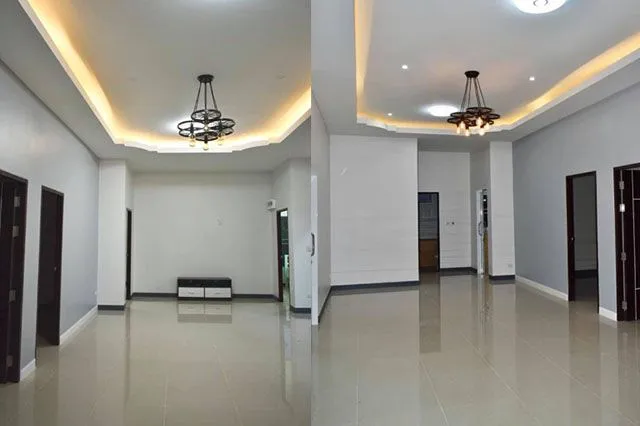 มาชมส่วนภายในบ้านกันบ้าง ส่วนแรกคือห้องโถง ผนังภายในทาด้วยโทนสีขาว พื้นปูด้วยกระเบื้องโทนสีครีม เพดานเป็นฝ้าหลุม ซ่อนไฟแสงสีเหลืองนวล พร้อมติดโคมไฟระย้า ภายในห้องโถงเน้นความโล่งกว้างของบ้าน