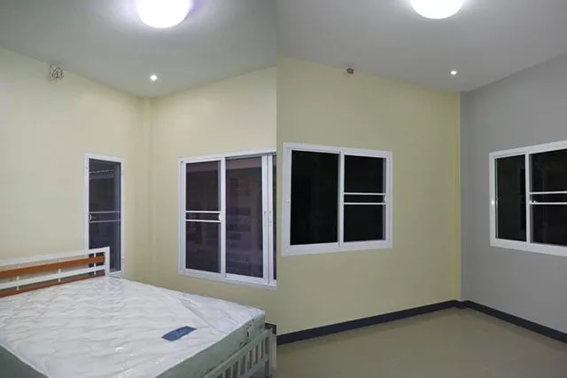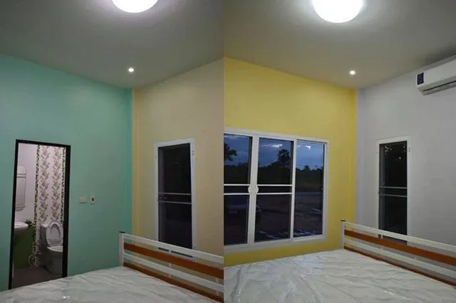 ตัวอย่างห้องนอนอีกห้อง ทาผนังด้วยโทนสีฟ้าอ่อน และเหลืองอ่อน เป็นการเลือกใช้โทนสีอ่อน ๆ เพื่อให้ความรู้สึกเรียบง่าย ผ่อนคลาย น่านอน พร้อมมีห้องน้ำในตัวด้วย