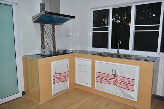 ห้องครัว มีเคาน์เตอร์ห้องครัว ที่ปูด้วยกระเบื้องโทนสีครีม ติดตั้งเตาแก๊สแบบสองหัว และมีซิ้งค์ล้างจาน พื้นด้านล่างปูด้วยกระเบื้องสีครีม มีเครื่องดูดอากาศ และมีหน้าต่างแบบบานเลื่อน เอาไว้ระบายกลิ่นที่เกิดขึ้นขณะทำกับข้าว