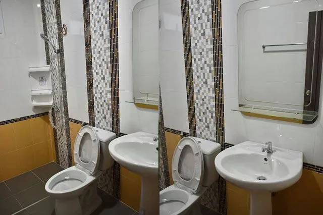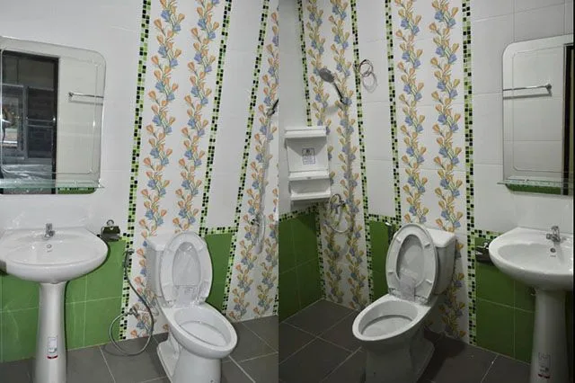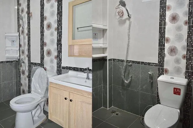ห้องน้ำอีกห้อง พื้นเป็นกระเบื้องโทนสีเทาเข้ม ผนังปูด้วยโทนสีเขียวอ่อน และสีขาว อีกส่วนก็เป็นแบบมีลวดลายสวยงาม มีเครื่องสุขภัณฑ์ที่จำเป็นครบครัน