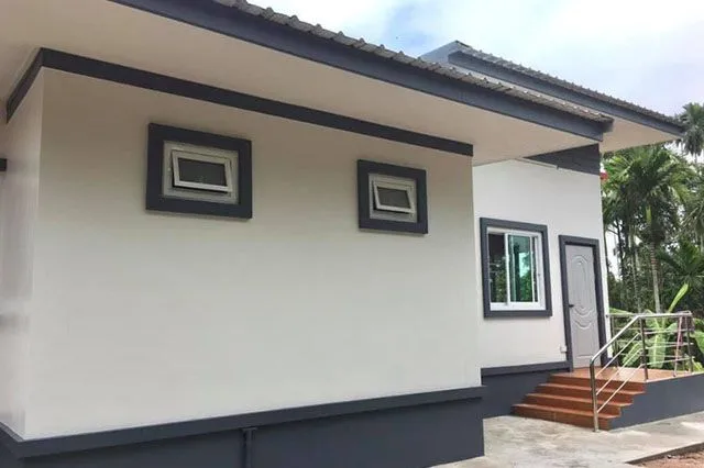 หลังบ้านในส่วนของห้องน้ำ ติดหน้าต่างสำหรับระบายอากาศไว้ด้วย และหลังบ้านยังมีประตูที่ทำจากพีวีซี สีเทาอ่อน มีระเบียงเล็ก ๆ ด้านหลัง ปูพื้นด้วยกระเบื้องโทนสีครีมเข้ม ราวบันไดทางขึ้น และระเบียงเลือกใช้สแตนเลส