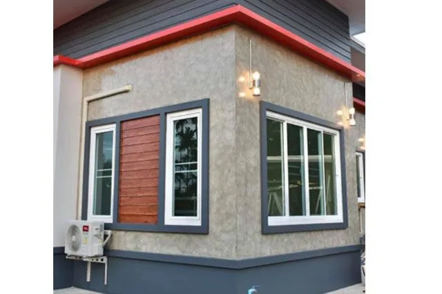 มุมหน้าบ้านในส่วนที่เป็นผนังแบบปูนลอฟท์ พร้อมติดหลอดไฟประดับสวยงาม
