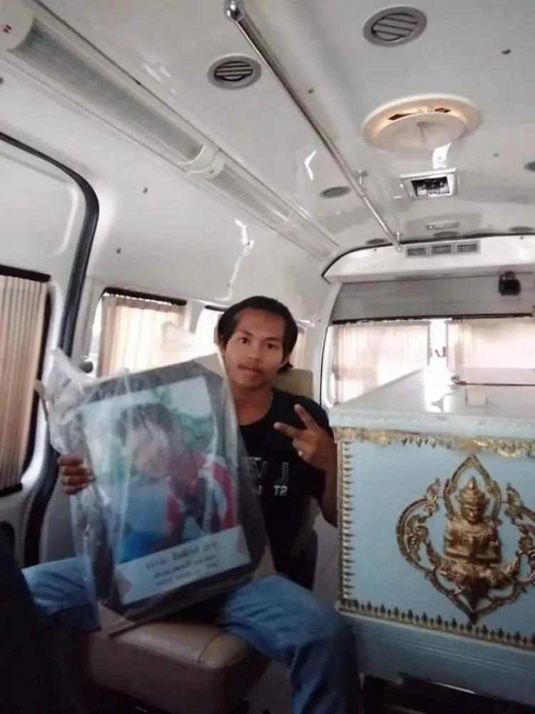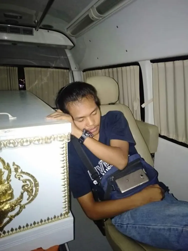 ซึ่งทั้งสองเป็นเพื่อนรักกัน หนุ่มน้อยนั่งอยู่กับโลงศพ น้องเต้ย เพื่อนรักของเขา ตั้งแต่ออกจากโรงพยาบาลตำรวจ กรุงเทพฯ จนมาถึงศรีสะเกษ โดยยังได้โพสต์เฟซบุ๊กว่า