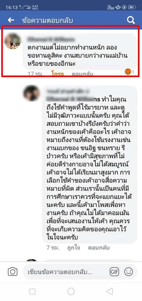 ทั้งนี้ ที่ตัดสินใจเข้าแจ้งความ เพราะคิดว่าการดูถูกเหยียดหยามคนอื่นเป็นเรื่องที่ไม่ควรเกิดขึ้น ไม่ว่าจะในชีวิตจริงหรือในสังคมออนไลน์ ถึงแม้ตนจะยากจน แต่ก็เป็นมนุษย์เหมือนกัน และ ต้องการให้เป็นตัวอย่างในสังคมให้เห็นว่าไม่ว่าใครจะรวยหรือจะจบการศึกษาสูงก็ไม่มีสิทธิ์ดูถูกคนอื่นที่ด้อยโอกาสกว่า