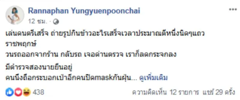 เรียกได้ว่าเป็นเรื่องราวที่แห่แชร์กันเป็นจำนวนมาก สำหรับเรื่องราวของนักร้องสาวแพท วงเคลียร์ ที่ได้ขับรถผ่านด่านตำรวจถึง2ด่าน โดยผู้ใช้เฟสบุ๊คที่ใช้ชื่อว่า Rannaphan Yungyuenpoonchai โดยได้โพสต์ข้อความระบุว่า
