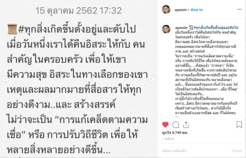 #ทุกสิ่งเกิดขึ้นตั้งอยู่และดับไป เมื่อวันหนึ่งเราได้คืนอิสระให้กับ คนสำคัญในครอบครัว เพื่อให้เขา มีความสุข อิสระในทางเลือกของเขา เหตุและผลมากมายที่สื่อสารให้ทุกอย่างดีงาม..และ สร้างสรรค์ ไม่ว่าจะเป็น การแก้เคล็ดตามความเชื่อ หรือ การปรับวิถีชีวิต เพื่อให้หลายสิ่งหลายอย่างดีขึ้น... ...ที่สุดแล้ว การหย่า ก็เป็นหนทางหนึ่งที่เกิดขึ้น จากการตัดสินใจร่วมกัน เราคุยเรื่องนี้กันมานานนับปี และ อยู่ในสถานะที่เป็นอิสระต่อกัน หลายเดือนมาแล้ว... ซึ่งครอบครัวของเราก็เข้าใจ และ ให้เกียรติในการตัดสินใจของเรา ...เมื่อชีวิตคู่ได้เป็นอิสระต่อกัน...