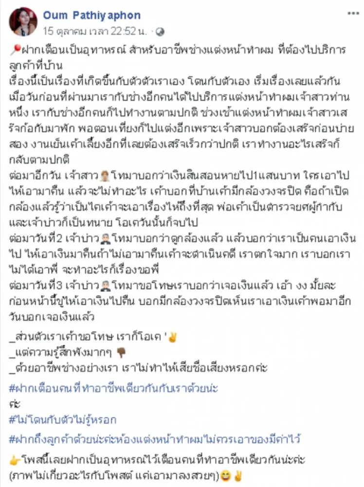 จากกรณีสาวช่างทำผมรายหนึ่งโพสต์เล่าเรื่องราวว่า ตนเองโดนลูกค้ากล่าวหาว่าขโมยเงินสินสอด 1 แสนบาท หลังจากไปทำผมให้เจ้าสาวที่งานแต่งงาน โดยเจ้าบ่าวอ้างว่าเห็นภาพจากกล้องวงจรปิด มีหลักฐานมัดตัวแน่น และขู่ว่าพ่อเป็นนายตำรวจใหญ่ ส่วนเจ้าบ่าวเป็นทนายความ สุดท้ายเจ้าบ่าวโทรศัพท์มาบอกว่าเงินที่หายไปนั้นหาเจอแล้ว โดยหล่นอยู่ในบ้านตัวเอง
