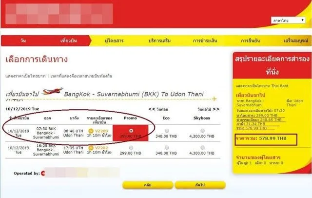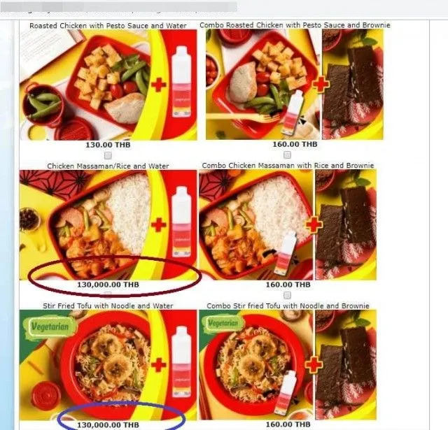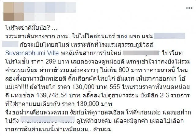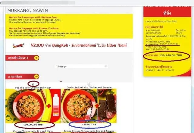 " ไม่รู้จะขำดีมั้ยน้อ ธรรมดาเดินทางจาก กทม ไม่ไปไลอ้อนแอร์ ก้อจะเป็นไทยสไมล์ เพราะพักที่โรงแรมสุวรรณภูมิวิลล์ Suvarnabhumi Ville พอดีเห็นสายการบินใหม่โปรโมทโปรโมชั่น ราคา 299 บาท เลยลองจองดูหน่อยดิ แรกๆเข้าใจว่าคงยังไม่รวมค่าธรรมเนียม ค่าภาษี รวมแล้วคงราวๆ ไม่เกิน 600 บาท ราคาขนาดนี้ ไหนลองสั่งอาหารชิมหน่อยดิ ติ๊กเลือกผัดไทยไก่ อันแรก เห็นราคาออกมา โอ้แม่เจ้า ผัดไทยไก่ ราคา 130,000 บาท 555 ไหนรวมราคาทั้งหมดหน่อยดิ แทบช๊อค 139,748.54 บาท คลิ๊กลงไปดูอาหารร้อน ยังมีอีก 2-3 รายการ ที่ใส่ราคาแบบเดียวกัน ราคา 130,000 บาท จึงขอฝากเตือนพรรคพวก ไงก็ให้ดูรายละเอียด ให้ดีๆก่อนเด้อ "