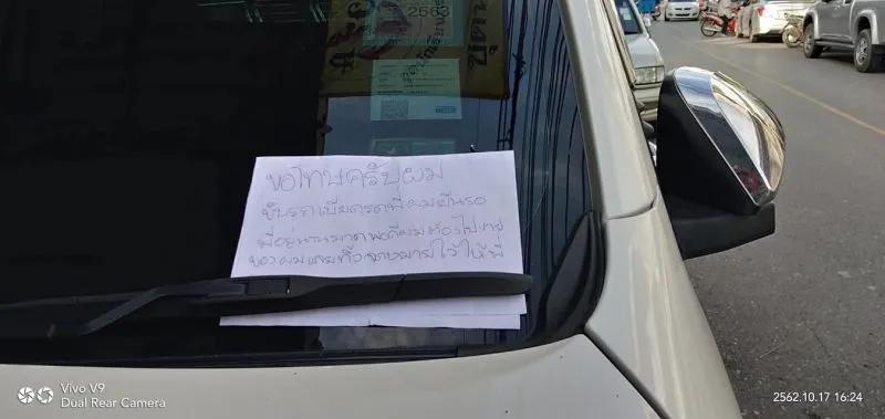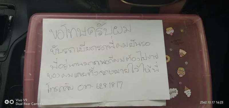 สวัสดีครับใครพอจะรู้จักหรือเป็นเจ้าของรถคันนี้กรุณาติดต่อกลับหาผมหน่อยครับ พอดีผมขับรถเบียดกับรถพี่ที่จอดไว้ครับ ผมยืนรออยู่นานมากไม่มีใครมา พอดีผมรีบไปขายของ ผมเลยเขียนจดหมายทิ้งไว้หน้ารถน่ะครับ #ขอโทษครับผมไม่ได้ตั้งใจและไม่คิดจะหนีครับ