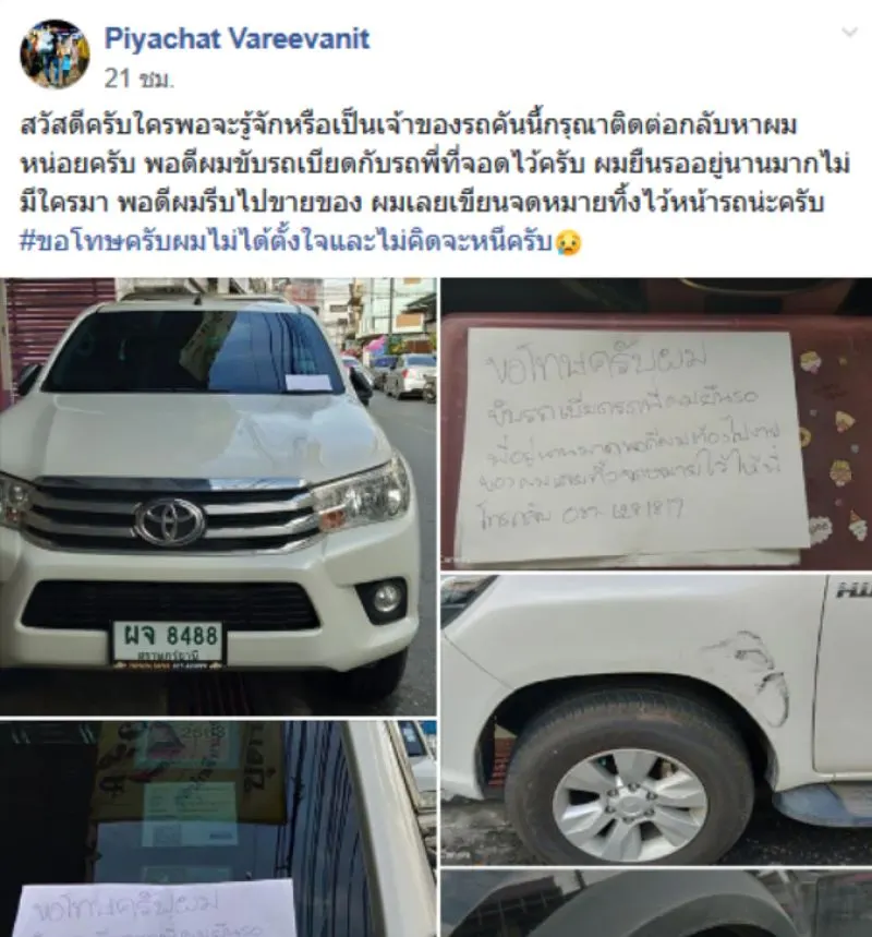 เรียกได้ว่าเป็นอีกหนึ่งเรื่องราวที่มีผู้คนชื่นชมอย่างมาก ในโลกออนไลน์ได้มีการแชร์โพสต์ ของผู้ใช้เฟซบุ๊กชื่อ Piyachat Vareevanit ซึ่งได้โพสต์ลงในกลุ่ม facebook สุราษฎร์ธานี หลังจากที่ตนนั้น ได้ขับรถไปเฉี่ยวรถกระบะคันหนึ่ง แต่ด้วยความที่ตนเองนั้นรีบไปขายของ จึงได้เขียนกระดาษแปะไว้ที่หน้ารถคันดังกล่าว เพื่อแสดงความรับผิดชอบ โดยเจ้าตัวได้โพสต์ว่า