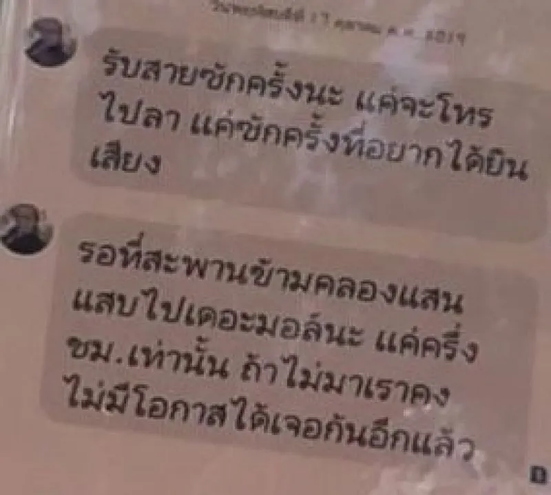 จากนั้นผู้ตาย ได้ส่งข้อความมาหาตนตอน 23.00 น. บอกว่าจะรอคนรักที่สะพานข้ามคลองแสนแสบ ซึ่งอยู่ใกล้จุดเกิดเหตุที่พบศพ โดยข้อความเน้นว่า ถ้าไม่มาที่สะพานก็ไม่ต้องพบกันอีกเลย ให้เวลาแค่ 30 นาทีเท่านั้น จากนั้นตนก็ติดต่อไปไม่ได้อีกเลย กระทั่งมาพบศพ คาดว่าผู้ตายน้อยใจ และคิดว่าตน จะบอกเลิก กระทั่งมาคิดสั้น เบื้องต้นเจ้าหน้าที่จะตรวจสอบวงจรปิดรอบจุดเกิดเหตุว่าผู้เสียชีวิตอยู่บริเวณใดก่อนจะกลายเป็นศพ