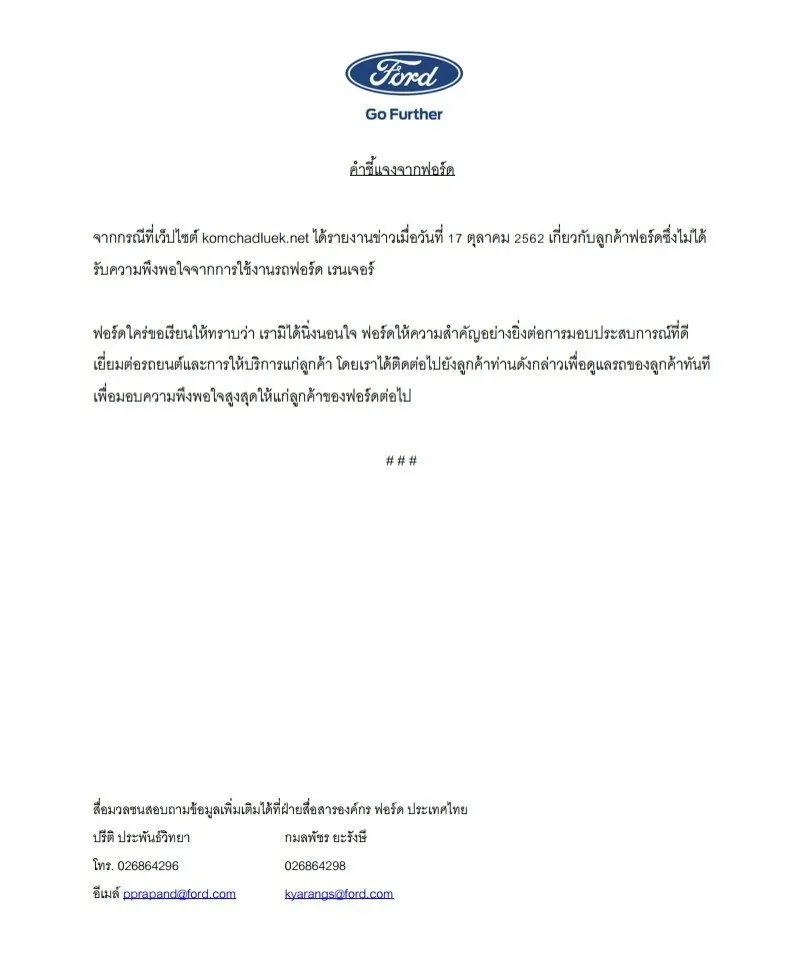 ล่าสุด ฟอร์ด ได้ออกเอกสารชี้แจง ระบุว่า "เกี่ยวกับลูกค้าฟอร์ดซึ่งไม่ได้รับความพึงพอใจจากการใช้งานรถฟอร์ด เรนเจอร์ ฟอร์ดใคร่ขอเรียนให้ทราบว่า เรามิได้นิ่งนอนใจ ฟอร์ดให้ความสำคัญอย่างยิ่งต่อการมอบประสบการณ์ที่ดีเยี่ยมต่อรถยนต์และการให้บริการแก่ลูกค้า โดยเราได้ติดต่อไปยังลูกค้าท่านดังกล่าวเพื่อดูแลรถของลูกค้าทันที เพื่อมอบความพึงพอใจสูงสุดให้แก่ลูกค้าของฟอร์ดต่อไป"
