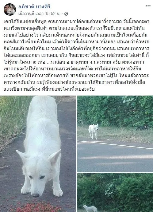 ผู้ใช้เฟซบุ๊คโพสต์ข้อความระบุว่า “เคยได้ยินแต่คนอื่นพูด คนเอาหมามาปล่อยแล้วหมาวิ่งตามรถ วันนี้เจอกะตา หมาวิ่งตามจนสุดฝีเท้า ตามไกลเลยเห็นสองตัว เราก็รีบขี่รถตามแต่ไม่ทันรถยนต์ไปอย่างไว กลับมาเห็นนอนหายใจหอบกันเลยถามเป็นไงเหนื่อยกันหละสิเอาไงพี่ตูบหิวไหม เจ้าตัวสีขาวนี่เดินมาหามานั่งมอง เราเลยว่าหิวหรอ กินไหมเดียวเทให้กิน เขามองไปยังอีกตัว(สีดำ)ที่อยู่อีกฝากถนน เราเลยเทอาหารให้และถอยออกมา เขาเลยมากิน”