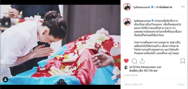 ลีเดีย โพสต์เล่าเรื่อง คุณตาที่เพิ่งเสียชีวิต นั่งเรือจากจีนมาไทยแบบ เสื่อผืนหมอนใบ กว่าจะมีวันนี้