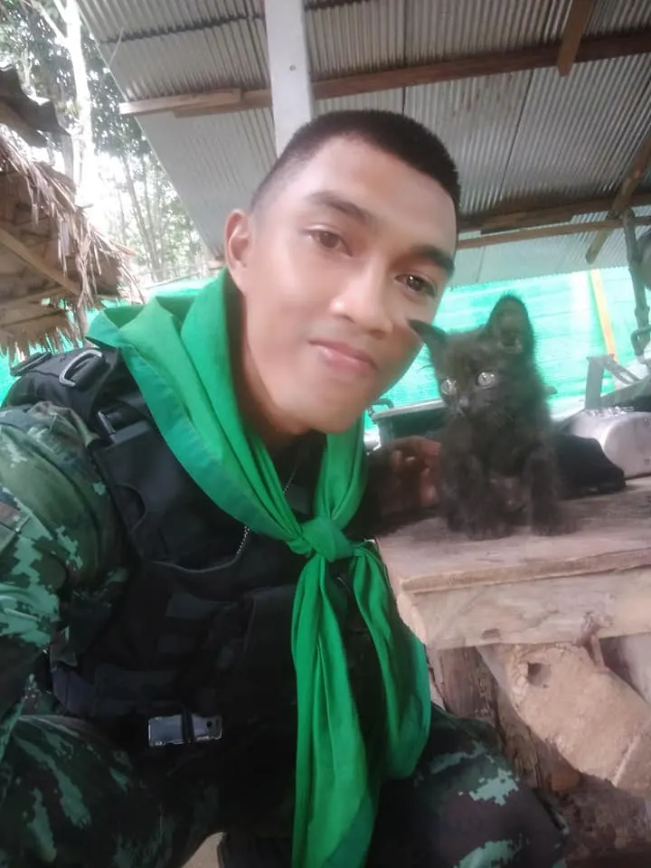 ซึ่งเข้านั้นได้โพสต์ข้อความระบุเอาไว้ว่า “มาอ้อนแบบนี้ อยากกลับฐานด้วยหรอขอคำแนะนำหน่อยครับ เจอในโรงเรียนแห่งหนึ่งระหว่างลาดตระเวนในหมู่บ้านระหว่างสงขลา ปัตตานีพวกผมควรทำไงดีครับหรือจะเอากลับหรือทิ้งไว้ที่เดิม น้องเป็นตัวเดียวที่เข้ามาอ้อนมานอนในเปลด้วยเลย”