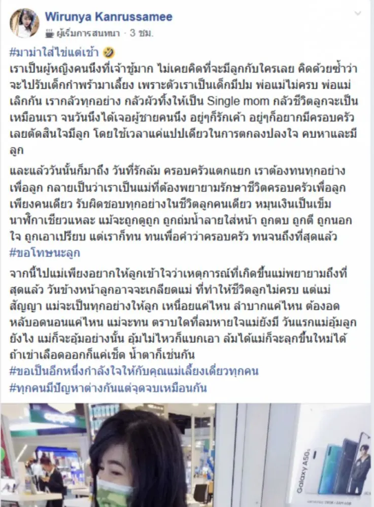 วันที่ 21 ตุลาคม 2562 ผู้สื่อข่าวสยามนิวส์รายงานว่า โลกออนไลน์มีการแชร์เรื่องราวของผู้ใช้เฟซบุ๊กชื่อ Wirunya Kanrussamee ได้โพสต์เล่าเรื่องราวโดยระบุข้อความว่า มาม่าใส่ไข่แต่เช้า เราเป็นผู้หญิงคนนึงที่เจ้าชู้มาก ไม่เคยคิดที่จะมีลูกกับใครเลย คิดด้วยซ้ำว่าจะไปรับเด็กกำพร้ามาเลี้ยง เพราะตัวเราเป็นเด็กมีปม พ่อแม่ไม่ครบ พ่อแม่เลิกกัน เรากลัวทุกอย่าง กลัวผัวทิ้งให้เป็น Single mom กลัวชีวิตลูกจะเป็นเหมือนเรา จนวันนึงได้เจอผู้ชายคนนึง อยู่ๆก็รักเค้า อยู่ๆก็อยากมีครอบครัว เลยตัดสินใจมีลูก โดยใช้เวลาแค่แปปเดียวในการตกลงปลงใจ คบหาและมีลูก