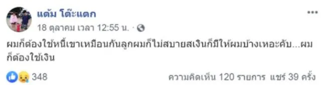 ทั้งนี้ ตลอดเวลาที่ลูกชายเครียดก็จะโพสต์ระบายลงเฟซบุ๊กเป็นประจำ ตนเองก็จะคอยไปคอมเมนต์เพื่ออยู่ข้างลูกชาย และให้กำลังใจเสมอ โดยก่อนหน้านี้ ลูกชายโทรศัพท์มายืมเงินตนเอง 20,000 บาท บอกว่ารถยนต์ประสบอุบัติเหตุ และให้ตนเองโอนเงินให้ ตนเองก็โอนเงินให้ แต่โอนเข้าในบัญชีของเมียอีกคนของลูกชาย