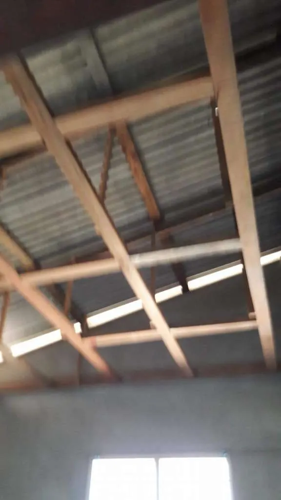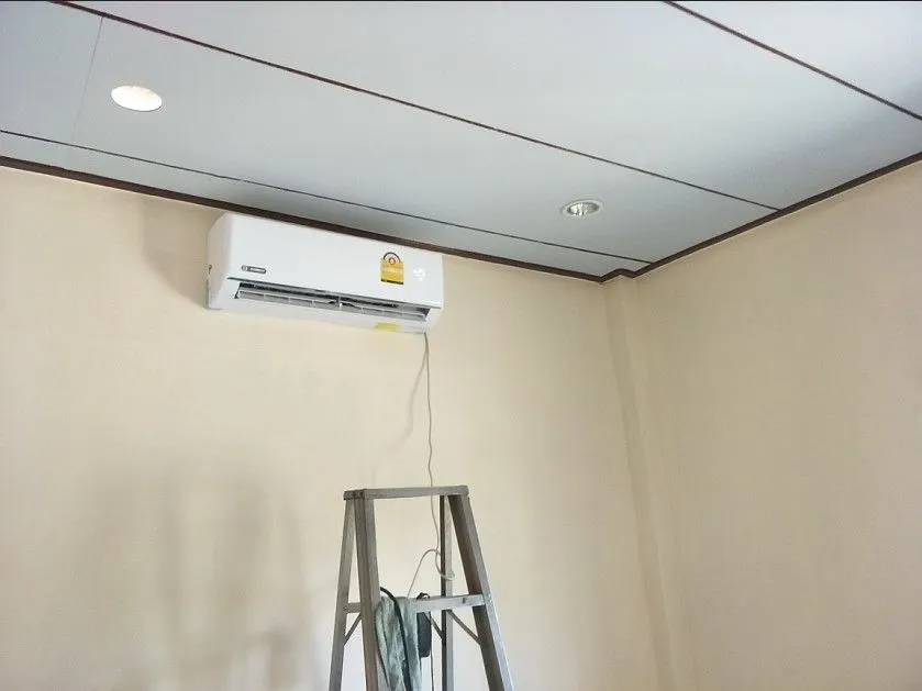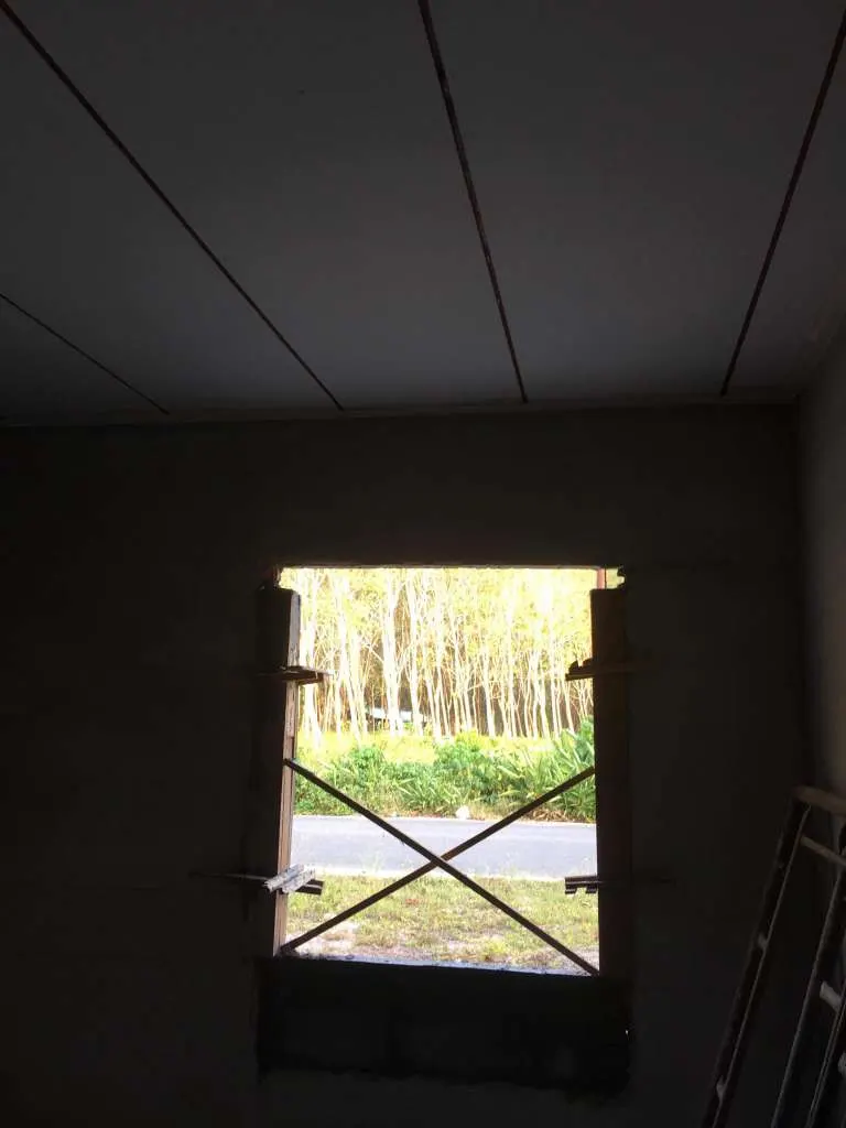 กั้นห้องเสร็จแล้ว ต่อไปช่างก็เริ่มตีฝ้าเพดาน เนื่องจากว่าบ้านของเจ้าของกระทู้มีช่องลมอยู่รอบบ้าน ช่างก็เลยอุดช่องลมโดยการใช้ปูนซีเมนต์โบกเข้าไป ตรงรูช่องลมแล้วก็ฉาบเรียบให้เป็นเนื้อเดียวกันกับผนังบ้าน ส่วนนี้เพื่อป้องกันคุณหนูเข้าไปเดินสวนสนามบนฝ้า นั่นเอง