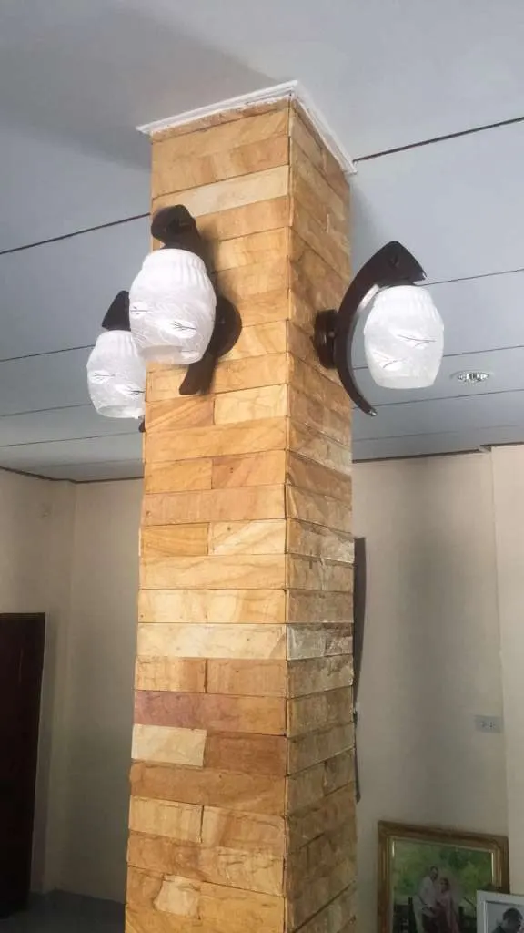 มาถึงในส่วนของไฟนั้นเจ้าของกระทู้วาดแปลนไฟเองโดยออกแบบและส่งไปให้คุณแม่แจ้งช่างทำไฟครับ แต่เมื่อเจ้าของกระทู้กลับไปดูบ้าน เจ้าของกระทู้เลยตัดโคมไฟช่อออก เพราะฝ้าเพดานบ้านไม่สูงมากนัก ถ้าติดโคมไฟช่อแล้วเกรงกว่าเจ้าของกระทู้จะเดินชน 5555+ และอีกอย่างเมื่อก่อนห้องนอนที่กั้นด้วยไม้นั้น มันคลุมเสากลางบ้านเอาไว้ พอรื้อห้องตรงนั้นออกทำให้เสานั้นอยู่กลางบ้านพอดี ช่างทำไฟเลยเสนอว่าให้ติดโคมไฟเล็กๆ รอบเสาทั้ง 4 ด้านโดยอยากให้หาอะไรมาปูเสานั้นไว้ ก็เลยได้ไอเดียเอาหินมาก่อไว้รอบเสาทั้งต้นเลย และก็ติดโคมไฟรอบ เลยดูเหมือนเป็นโคมไฟช่อแทน